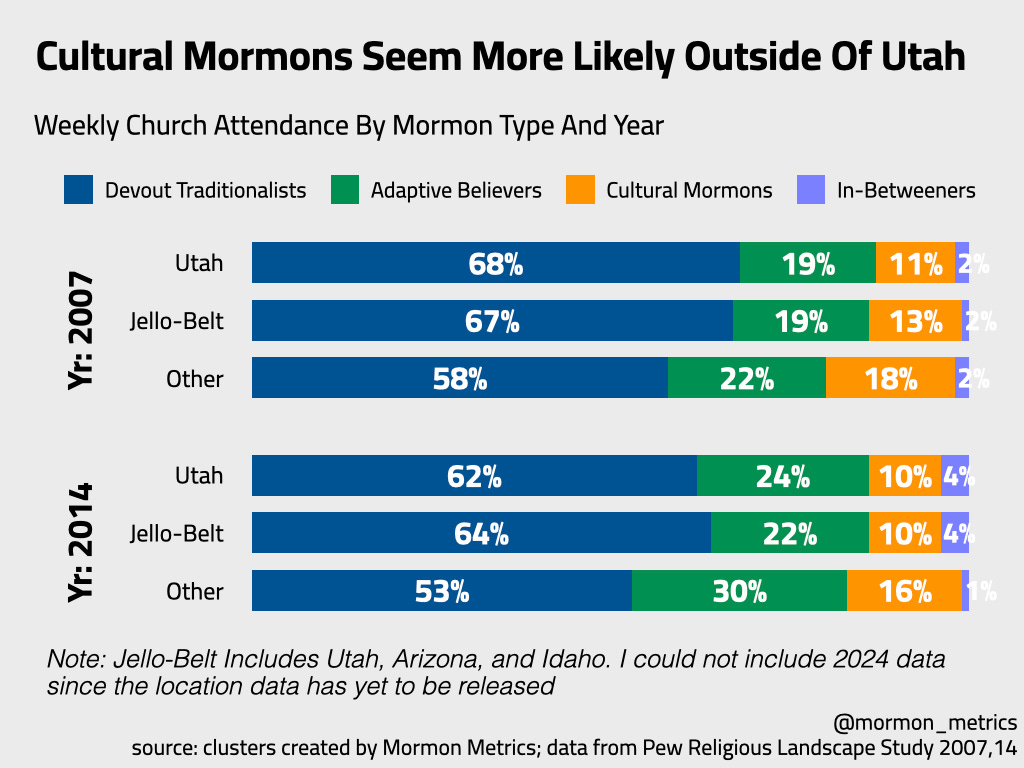 And, as we’ll explore in this post, Utah Latter-day Saints are more likely to be devout and Cultural Mormons are more common outside Utah!