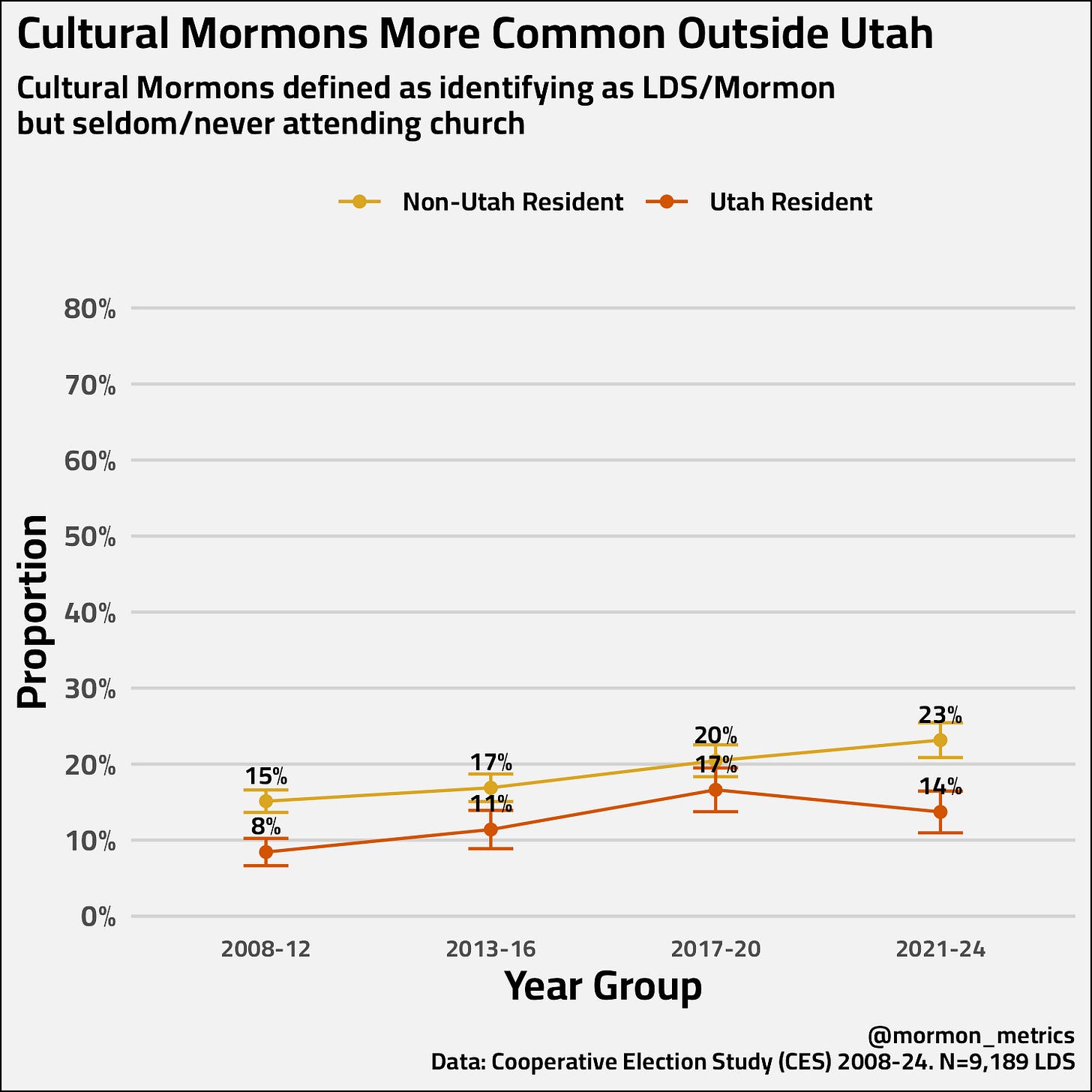 Our CES data confirms that Cultural Mormons seem to be more likely outside of Utah and this is statistically significant in 3 of our 4 year groups. In the most recent years, proportionally there are 50% more cultural Mormons outside of Utah vs inside.