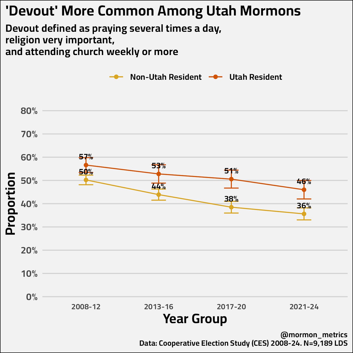 Over time, we see devout inside and outside of Utah declining, but notice for each year group Utah residents are statistically significantly more likely to be devout. While I didn’t include a chart, we see the same trend inside and outside the Jello-belt (Idaho, Utah, Arizona).