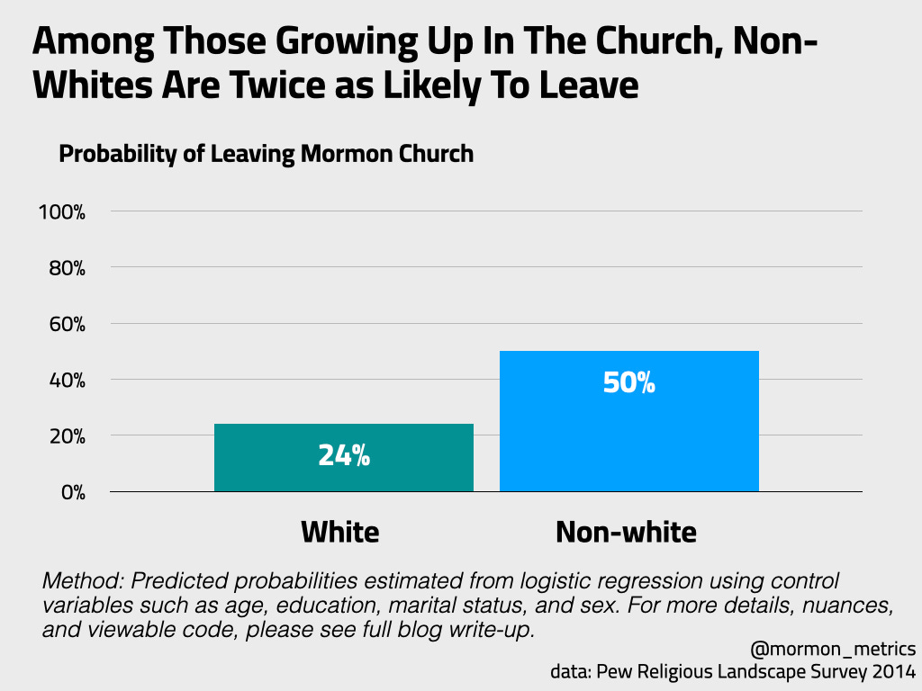One problem the church must confront is how to better appeal and keep non-white members. As you can see in the figure above, Non-white members are twice as likely to leave than white members. Remember the figure above is only among those who claimed to grow up in the church. I imagine the retention rate of non-white US converts could be worse than this!