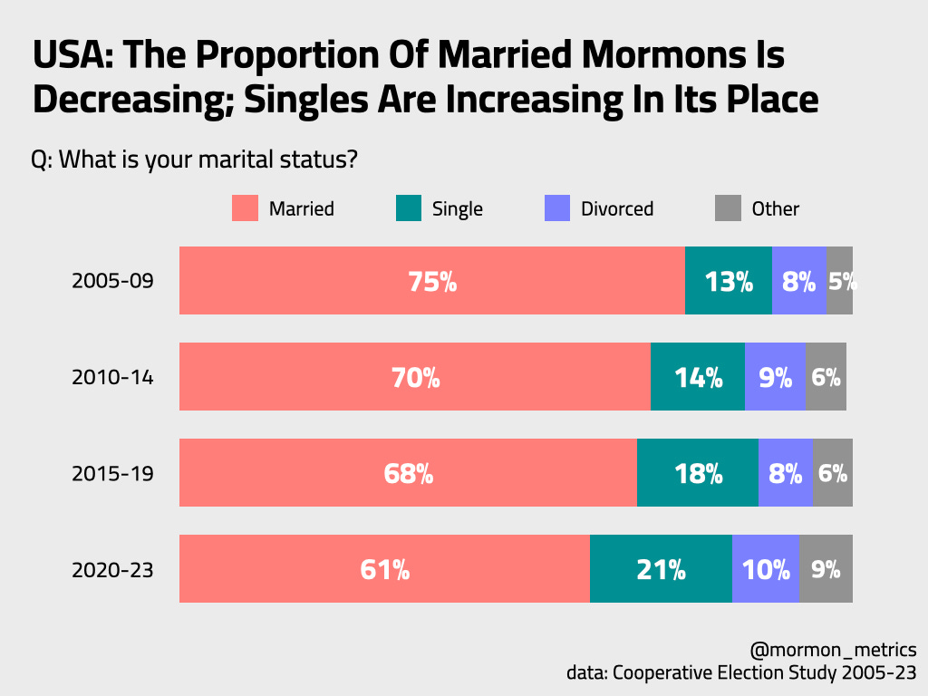 One additional thing I’ll note with the chart above is that even though married Mormons are decreasing, divorced Mormons are not. Divorced Mormons are still the same proportion (if not a bigger proportion) than 15 years ago. This could suggest that the Mormon divorce rate is rising.