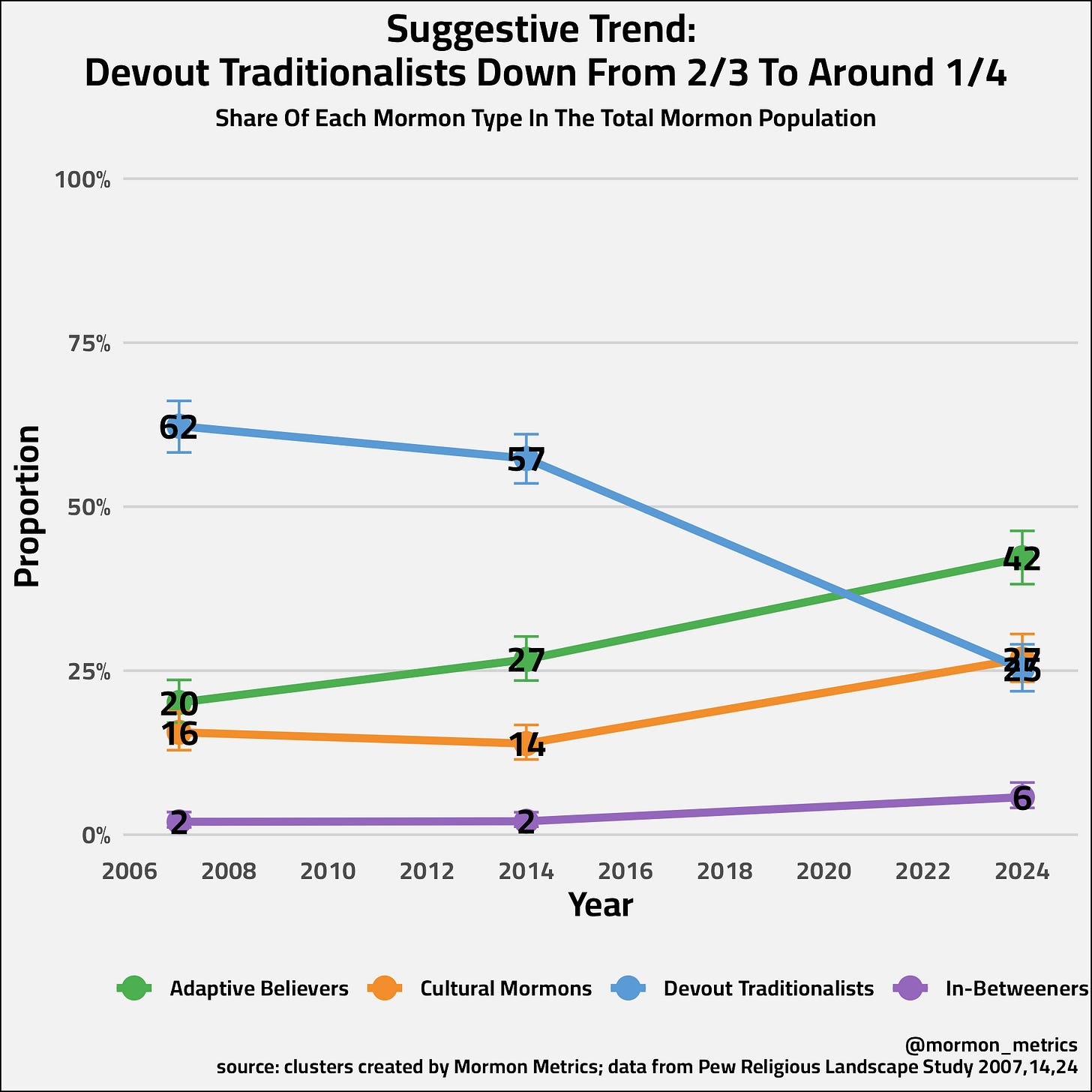 The Devout May No Longer Define Mormonism. In 2007, nearly two-thirds of Mormons were Devout Traditionalists. By 2024, that share appears to have dropped to about one-quarter.
